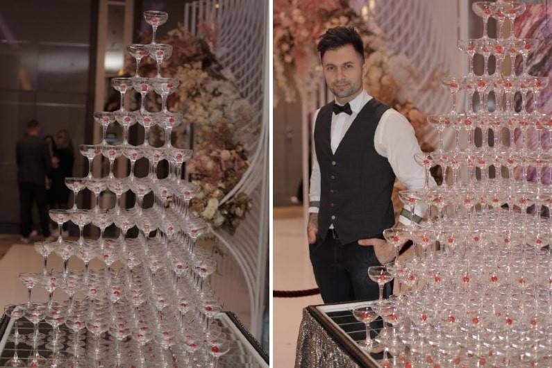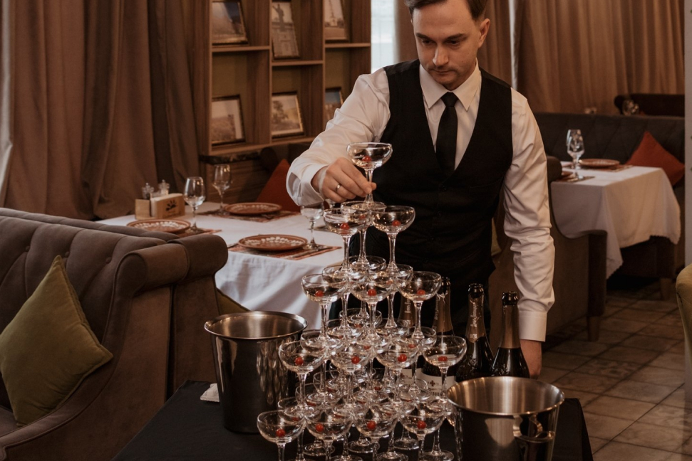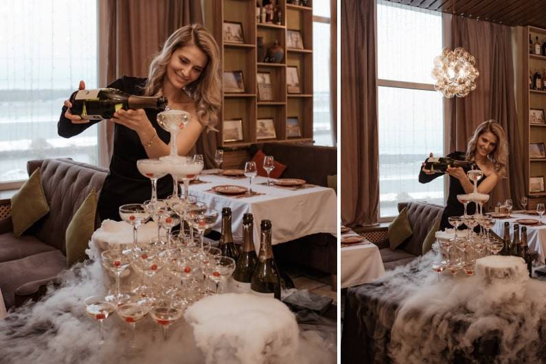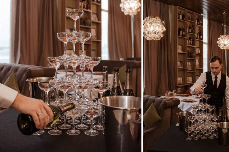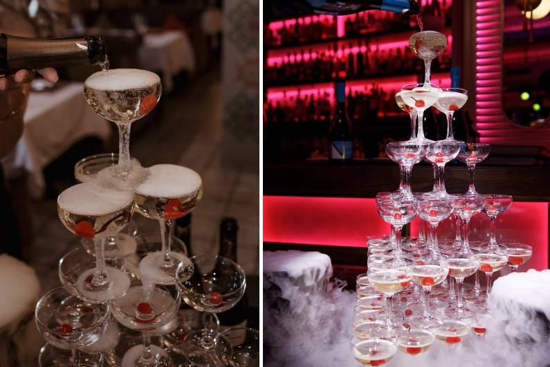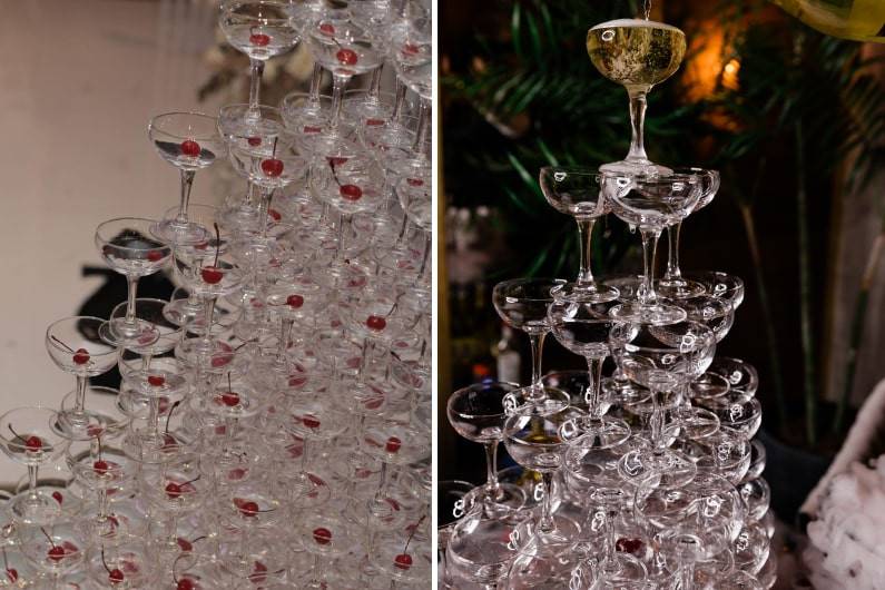 Пирамида из бокалов шампанского - это аттракцион для гостей, позволяющий превратить подачу аперитива в эстетически прекрасное действо и впечатляющее шоу.