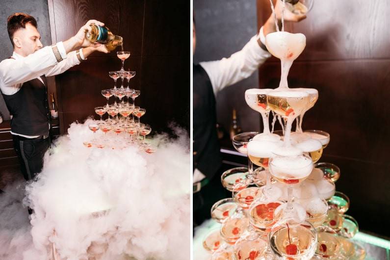 - Бокалы для шампанского можно украсить ягодами вишни Яркий красный цвет ягод отлично контрастирует с прозрачными стеклянными бокалами и придает композиции свежесть и яркость. - Очень зрелищно смотрится пирамида-шампанское с сухим льдом. Благодаря ему горка окутывается загадочным туманом, делающим атмосферу более торжественной и романтичной. Пирамида из шампанского – конструкция достаточно сложная и, что немаловажно, довольно хрупкая (есть риск падения, возможные травмы и дополнительные затраты на покупку бокалов.) Поэтому лучше доверить создание шедевра профессиональному бармену.