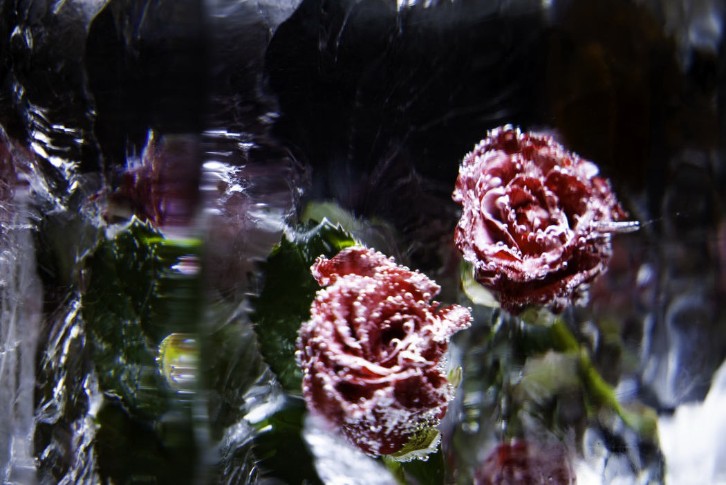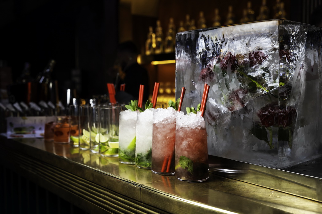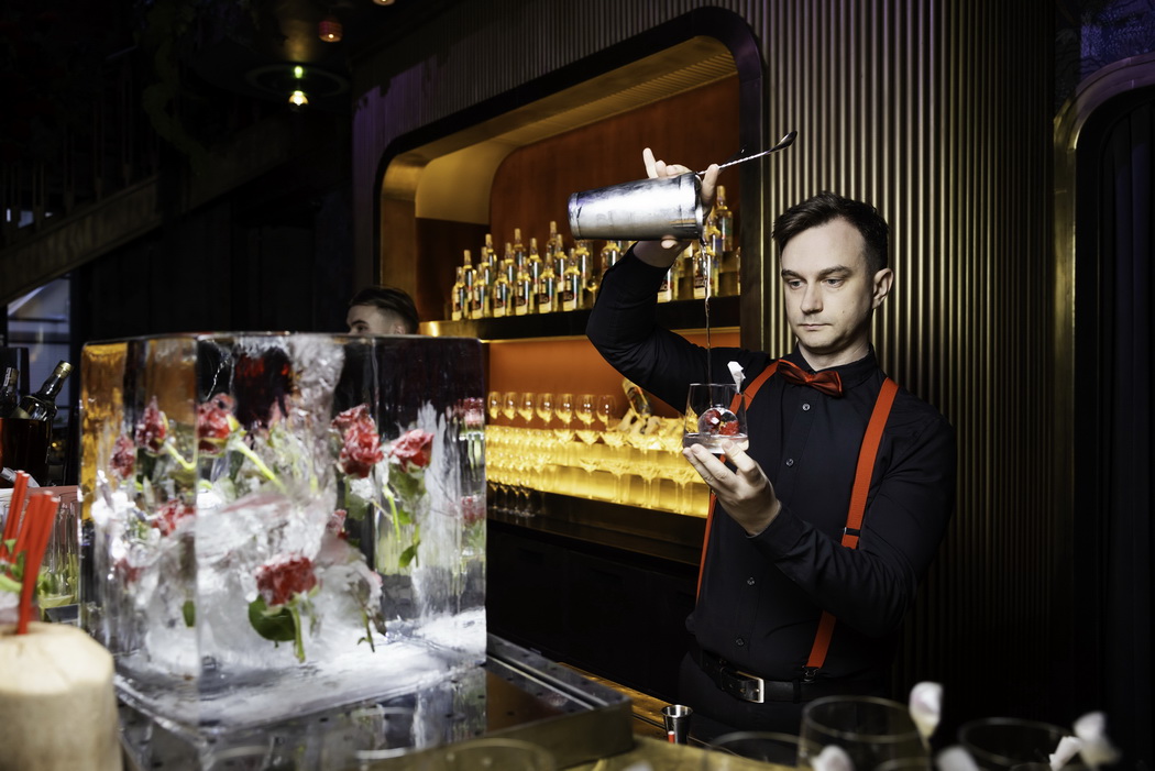 Для декора бара мы использовали дикий лед — ледяные глыбы в которые вморозили красные розы, добавляя шарма и изысканности мероприятию.